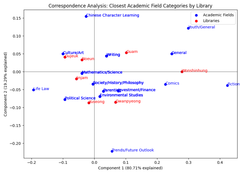 - We employed Correspondence Analysis to visually explore the correlations in categorical data. By using loan frequency as a measure of each library’s usage demands and analyzing attributes of popular books (such as subject classification numbers, academic fields, target audiences, interests, and genres), we identified each library’s usage demands and determined whether a mismatch exists between the programs and user needs.