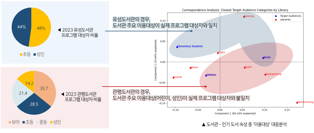 Correspondence analysis between the “library name” category and the target audience category was performed to verify the alignment between the main user base and the program target audience.