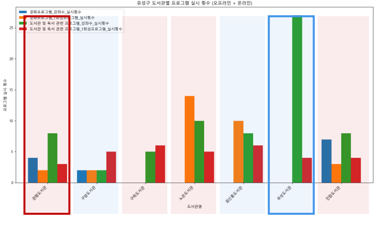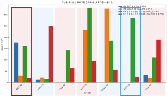 However, Yuseong-gu suffers from a severe lack of public library programs. Despite having more libraries and higher user counts than Daedeok-gu, it offers fewer programs. Similarly, even though Jung-gu has fewer libraries, the presence of the Daejeon Student Education and Culture Center—which offers many programs—and Hanbat Library, essentially Daejeon’s central library, further highlights that Yuseong-gu ranks low in program offerings despite its strong figures.