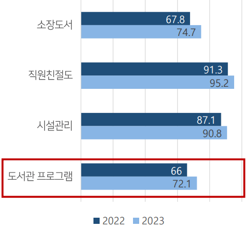 In Yuseong-gu, the satisfaction with public library programs is also low. The results of the satisfaction surveys conducted in 2022 and 2023 for Yuseong-gu public libraries reveal that satisfaction with library programs is noticeably lower compared to other areas of the library.