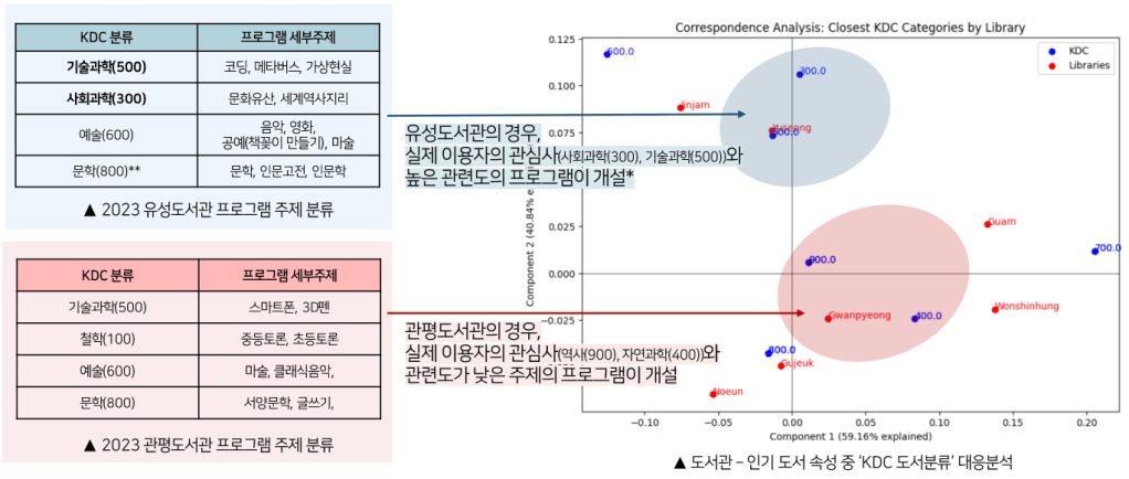 - Gwanpyeong Library: It was observed that the user interest topics—such as history (KDC 900 range) and literature (KDC 800 range)—differ significantly from the program topics actually offered. The programs focus on areas like technology and science, philosophy, and art, which fail to reflect the demands of the users.