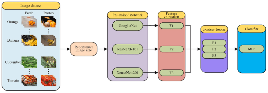 The architecture applied to all three freshness detection models is identical. Specifically, for the same food ingredient image, three pre-trained and fine-tuned Convolutional Neural Networks—DenseNet, GoogleNet, and ResNext—extract features of dimensions 1,024, 1,024, and 2,048 respectively. These features are then passed through individual MLPs to generate three 256-dimensional feature vectors. The vectors are concatenated to form a 768-dimensional feature, which is fed into a final MLP Classifier Network that outputs linear scores for each freshness class. Finally, the SoftMax Activation Function is applied to yield probability scores for each class, with the class having the highest probability selected as the final prediction result.