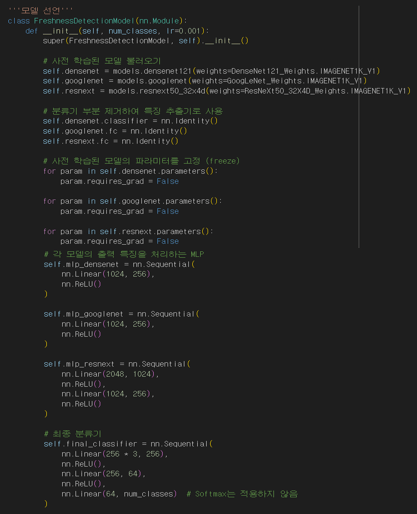When a composite image of food ingredients is input, the overall pipeline is divided into two main stages. The first stage is Food Ingredient Object Detection, which swiftly and accurately detects each food ingredient object in an image containing multiple items. The second stage is Freshness Classification, which precisely categorizes the freshness of each detected food ingredient object. This project was initiated to support healthy eating habits for individuals living alone through a food ingredient sharing service and to address food waste issues, focusing on developing the core models that will form the service.