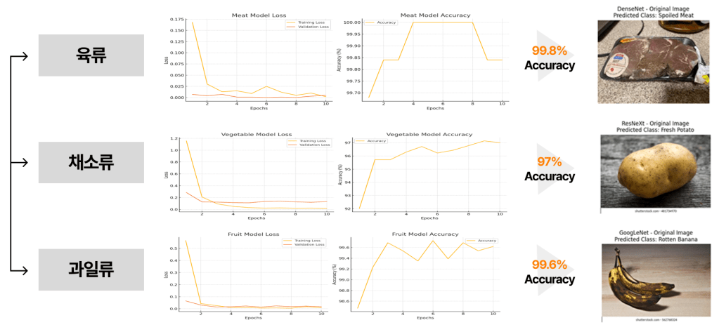 Among the over 40 labels obtained during the object detection phase, we selected 11 labels with sufficient image data for freshness evaluation and trained the freshness classification models on them. Training was conducted over 3 epochs, and the test set achieved the following high accuracies: