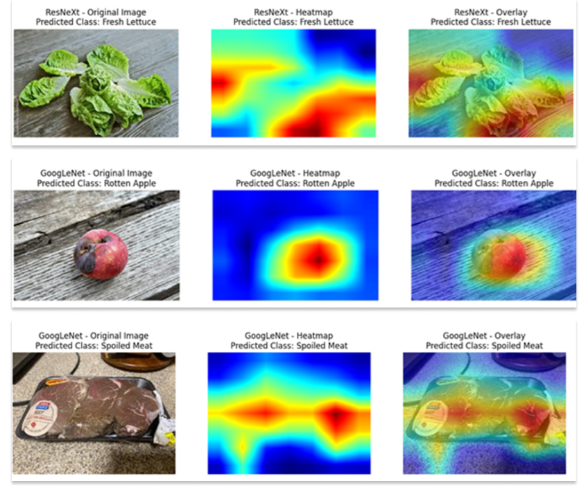 From the perspectives of Explainable AI and Human in the Loop AI, we applied the Gradient CAM (G-CAM) technique to secure the explainability of our CNN. This method calculates the importance of each feature based on the gradients of the predicted Linear Class Score with respect to the high-dimensional Feature Map obtained from the CNN’s last convolution layer, thereby generating a Class Activation HeatMap of size H×W. By interpolating and overlaying this HeatMap to match the size of the original image, we were able to clearly visualize which visual features the model relied on for its decision-making. By integrating three fine-tuned networks—DenseNet, GoogleNet, and ResNext—we confirmed that various visual features such as background, objects, fresh areas, spoiled areas, and damaged areas can be effectively extracted.