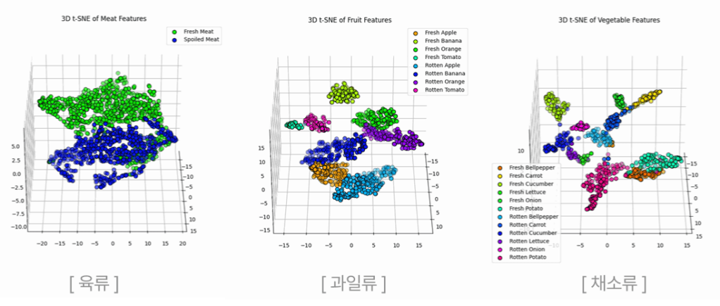 To effectively project data from the high-dimensional Feature Space into a lower-dimensional space for visualization, we applied the non-linear dimensionality reduction technique T-SNE. T-SNE calculates the similarity between each data point in the high-dimensional space using a Gaussian distribution, and in the low-dimensional space, it recalculates the similarity using a T-distribution, operating by minimizing the Kullback-Leibler Divergence between the two distributions. As a result of projecting the 768-dimensional Feature Space used for final classification into three dimensions, we were able to confirm that the visual features related to freshness for each food ingredient group—such as meats, vegetables, and fruits—form clear clusters, thereby proving that the model has learned meaningful features.